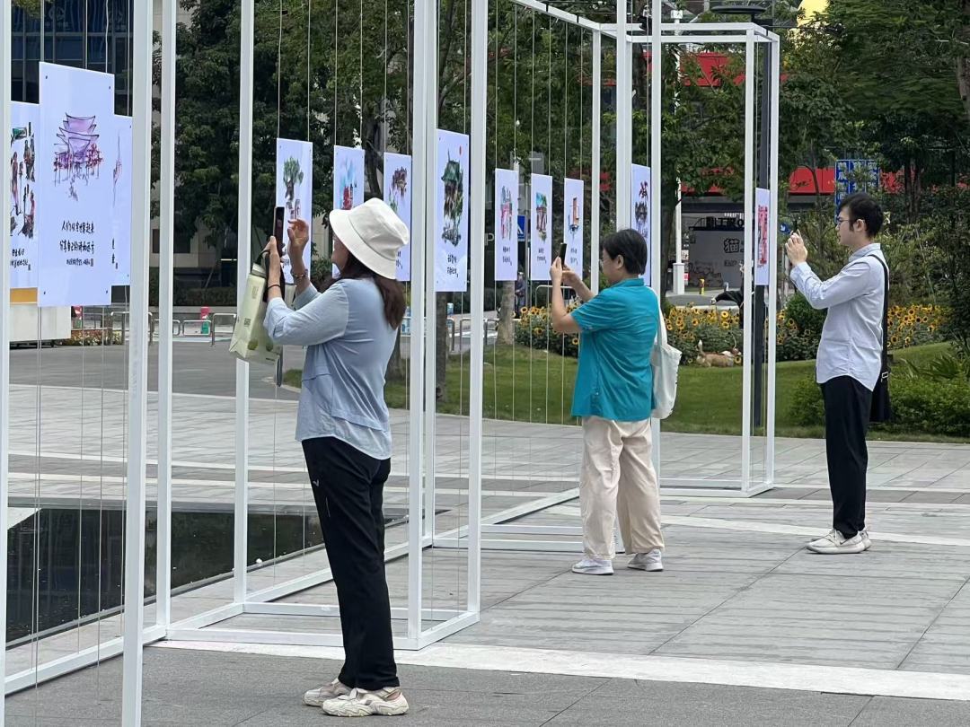 尤其值得一提的是,现场有多幅漫画是立体化呈现的,每一处景色仿佛都能从画中走出来,沉浸感十足。“我们选择在广场做户外展览,市民游客无需预约,让观展更休闲、放松。”小林表示,“所有画作用玻璃绳悬挂,有风吹来时,画作会轻轻晃动,让展览更富动感;同时安装了灯光装置,晚上展区亮灯时,与月光宝盒的光影效果相得益彰。”