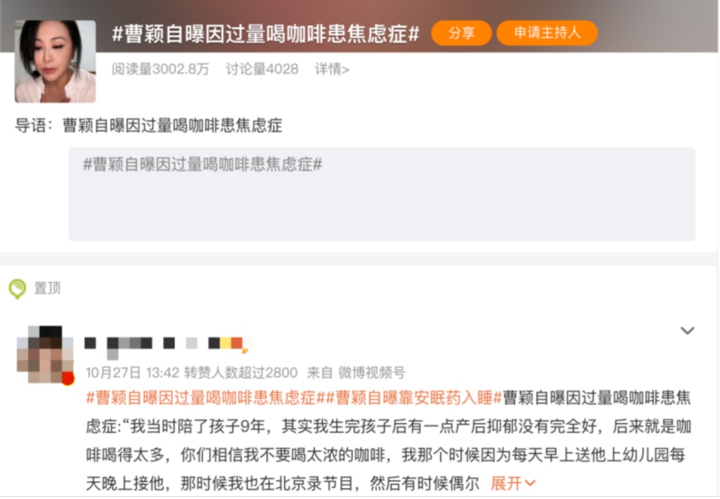 10月26日,#曹颖自曝因过量喝咖啡患焦虑症#登上热搜话题。社交媒体平台 图