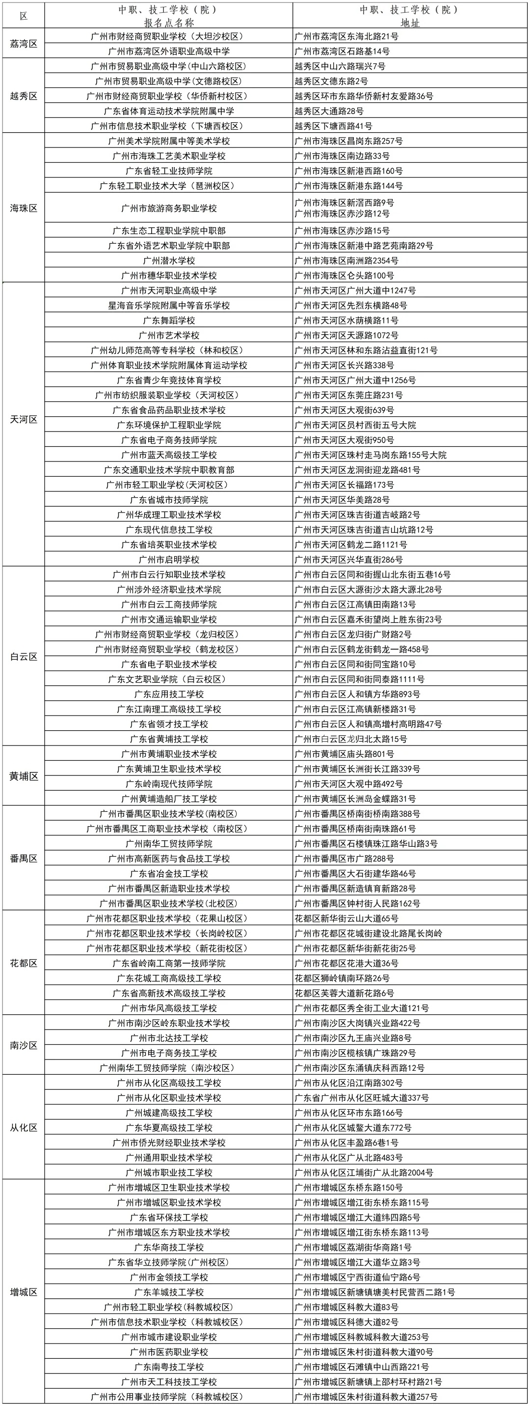 答:广州市大部分中职学校(职高、技工、技师)都开设了高考报名点,可为本校应届生报名。具体名单如下:
