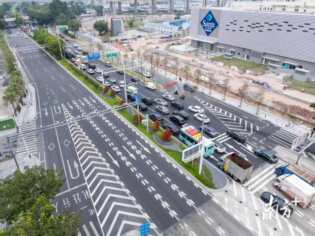 对此,荔湾区精准对接山姆会员店开业后的交通增量需求,启动岭南V谷周边道路建设工程,除对花地大道西侧原有辅路进行改造,增加一车道外,新增修建一条花地大道东侧辅道,新增两条车道直达山姆会员店(荔湾店)。
