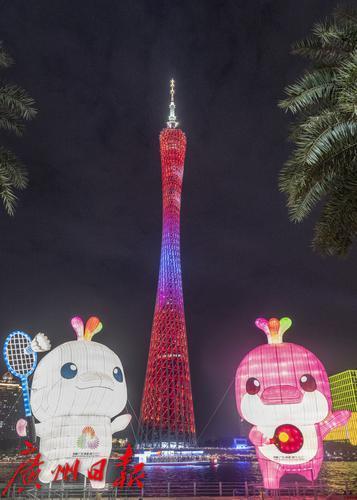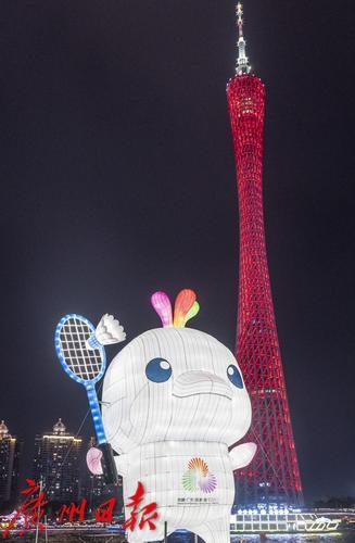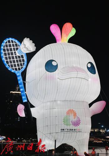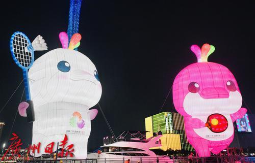 值得一提的是,本次吉祥物采用岭南非物质文化遗产——“彩扎”技艺制作。该技艺以竹篾为骨、色纸为衣,传承广府匠心,并与现代结构工艺相融合,实现了传统非遗与现代设计的创新对话。该大型装置依托趸船“落户”珠江中轴线水域,与地标建筑广州塔交相辉映,为珠江夜景增添青春与活力,也将成为广州城市形象和品牌传播的重要标志。