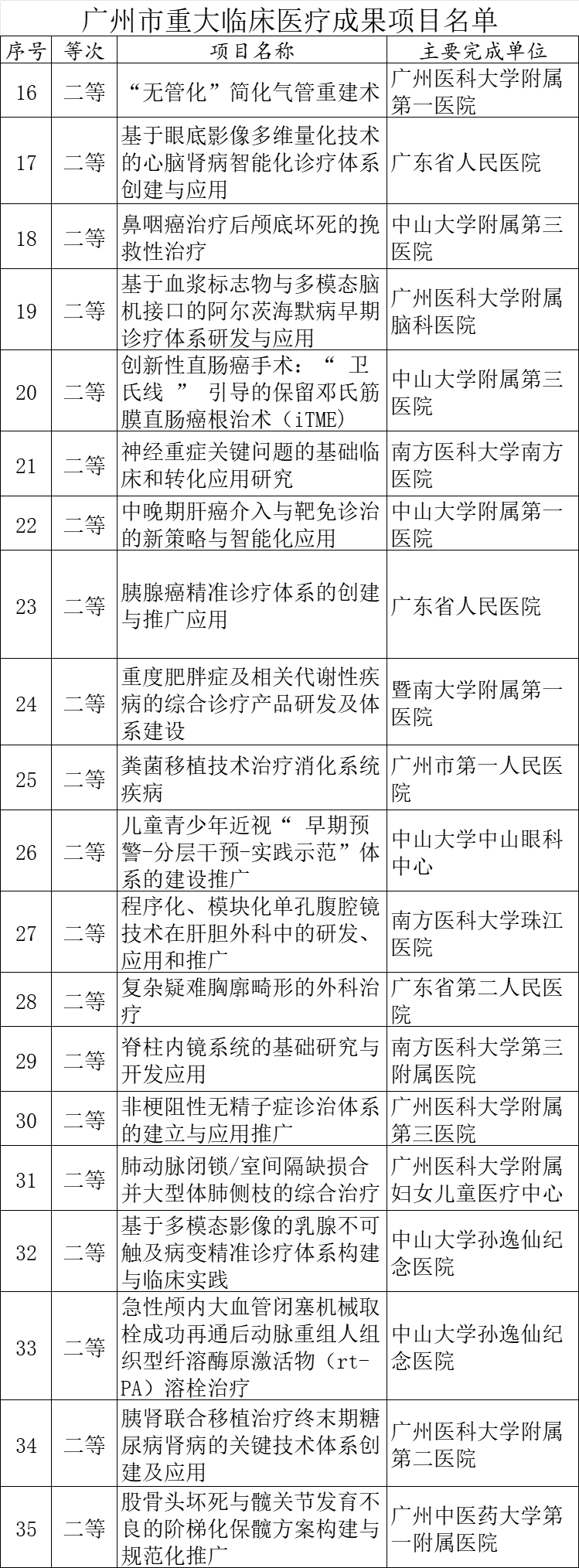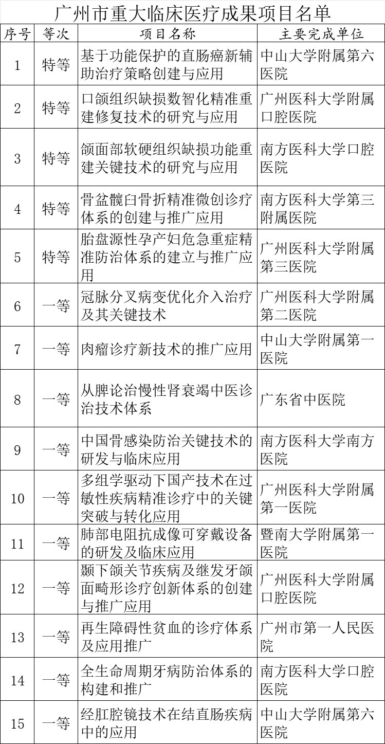 其中,广州市重大临床医疗成果是广州市卫生健康委首次评选的医疗成果项目,是广州市卫生健康委在广州市临床高新、重大和特色技术等医疗高地建设过程中,产生的一批代表着广州市临床医疗最高水平的建设成果,凝聚着团队数年甚至数十年的坚守与探索,不仅提高了全市的医疗卫生服务质量和水平,更提升了广州医疗在全国乃至国际上的影响力。