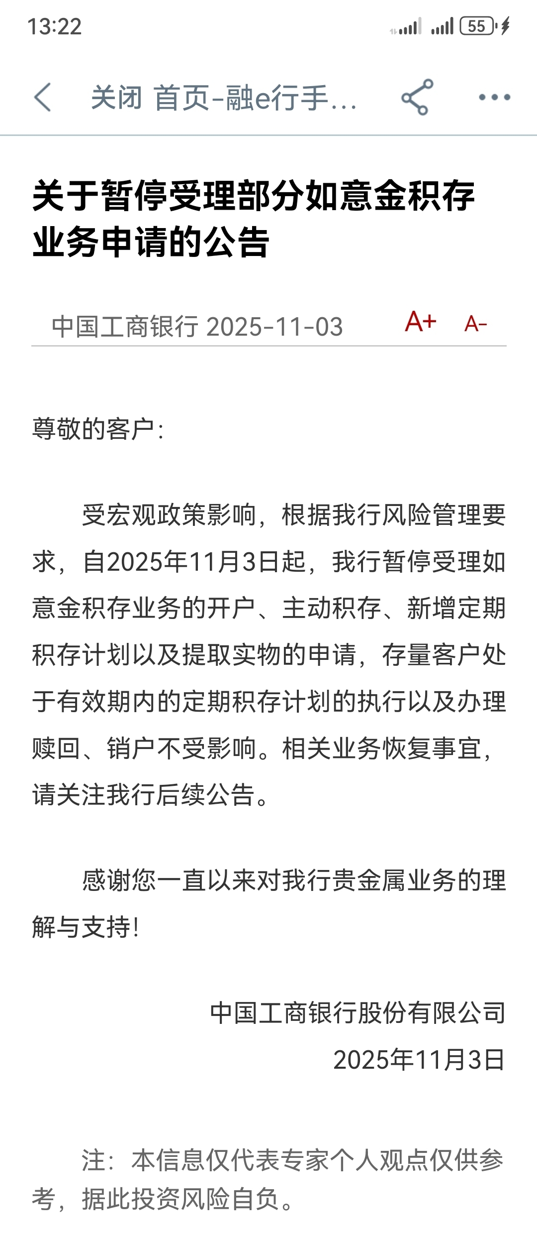 11月3日上午,工商银行发布关于暂停受理部分如意金积存业务申请的公告。工行称,受到宏观政策影响,工商银行暂停受理如意金积存业务的开户、主动积存、新增定期积存计划以及提取实物的申请。