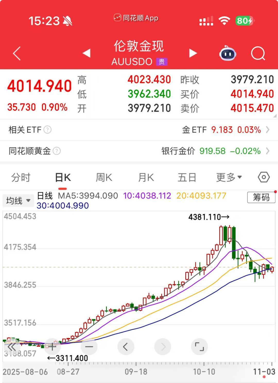 (截至11月3日15时23分伦敦金现价格走势,图源:同花顺)