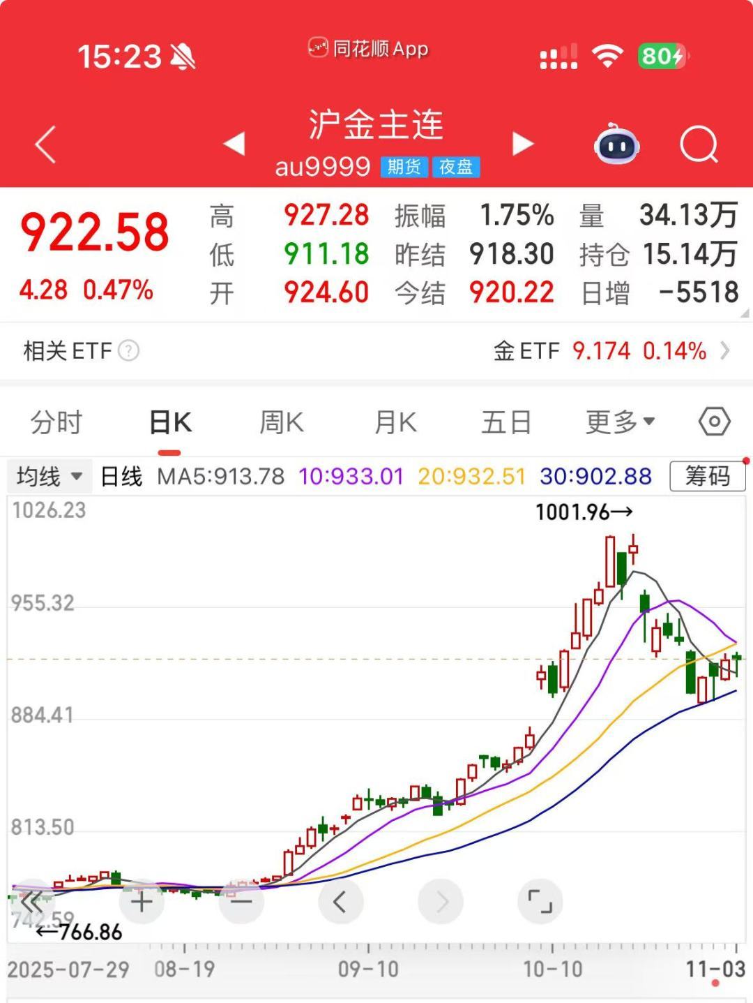 (截至11月3日15时23分沪金主力合约价格走势,图源:同花顺)