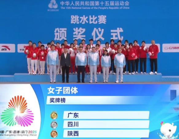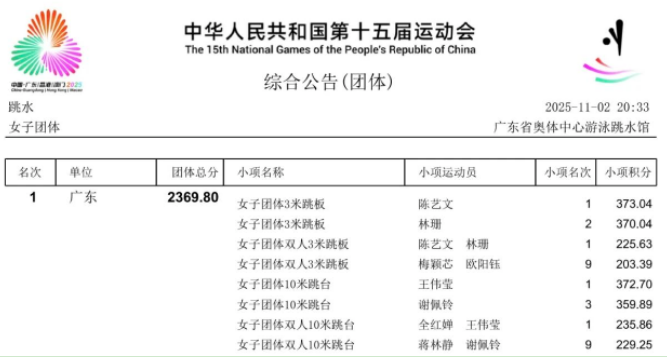 11月2日晚,广东奥体中心游泳跳水馆内掌声雷动。随着最后一轮动作完成,广东跳水女队凭借稳定且出色的发挥,以总分2369.8分成功卫冕十五运会跳水女子团体冠军。