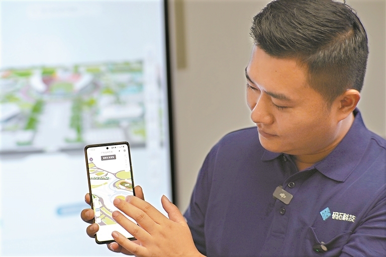 工作人员演示“全运广州”小程序的“AR导航”功能。广州日报新花城记者 王维宣 摄
