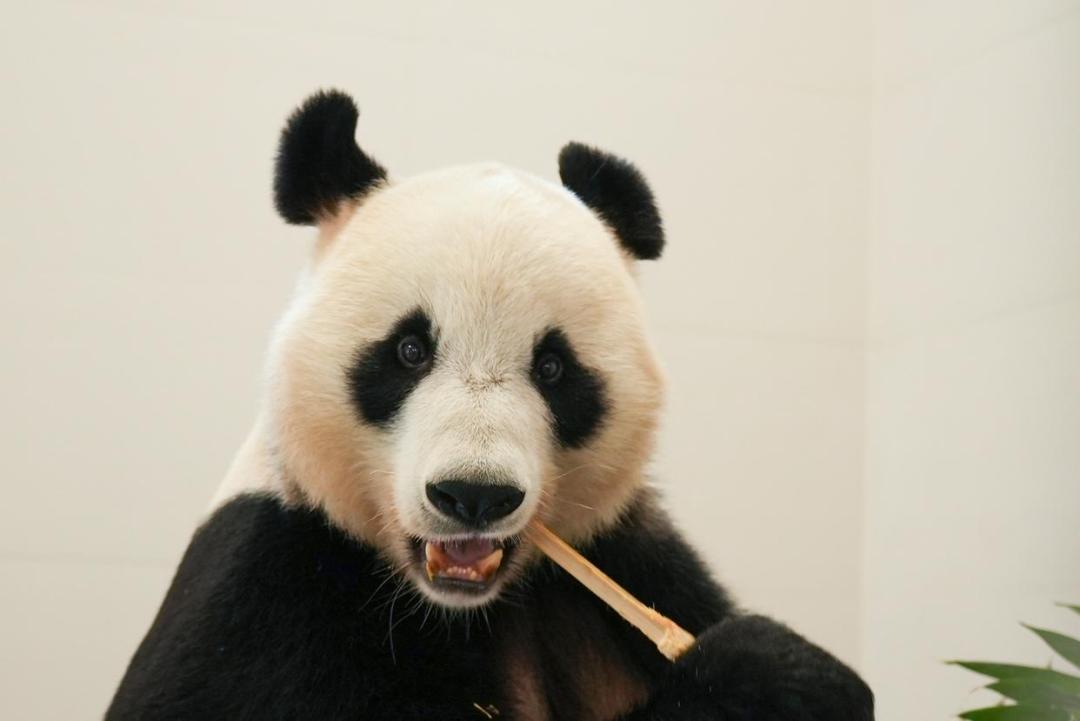 11月4日,在中国大熊猫保护研究中心绵阳基地,大熊猫“华豹”入住圈舍后吃竹子。新华社发