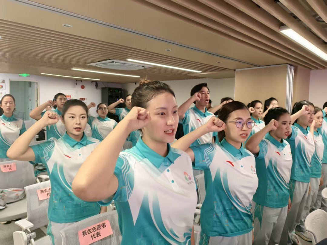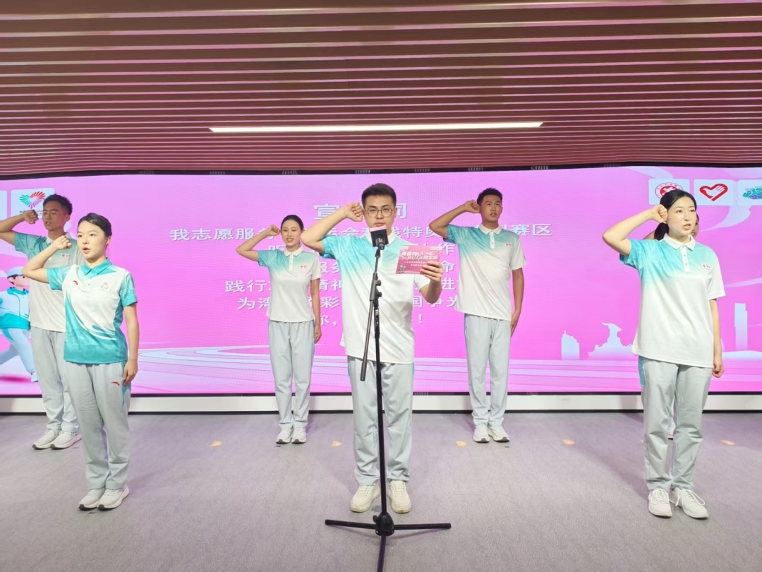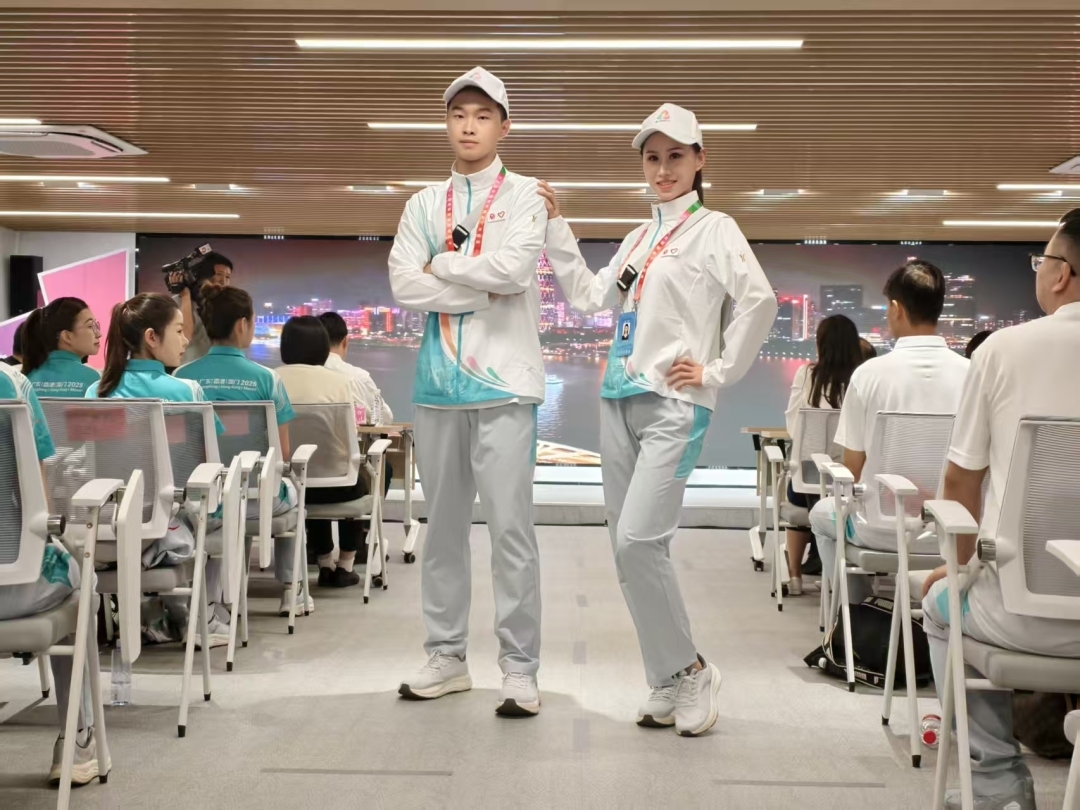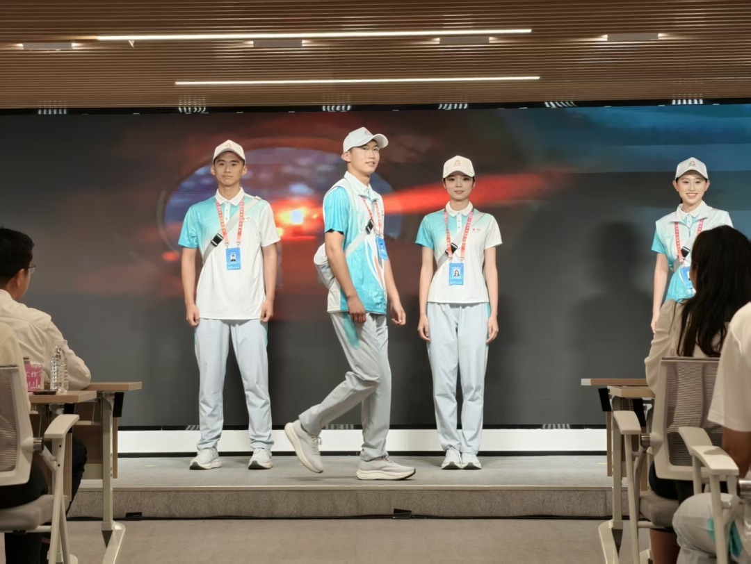 志愿者穿全运新装进行展示,朝气蓬勃活力满满