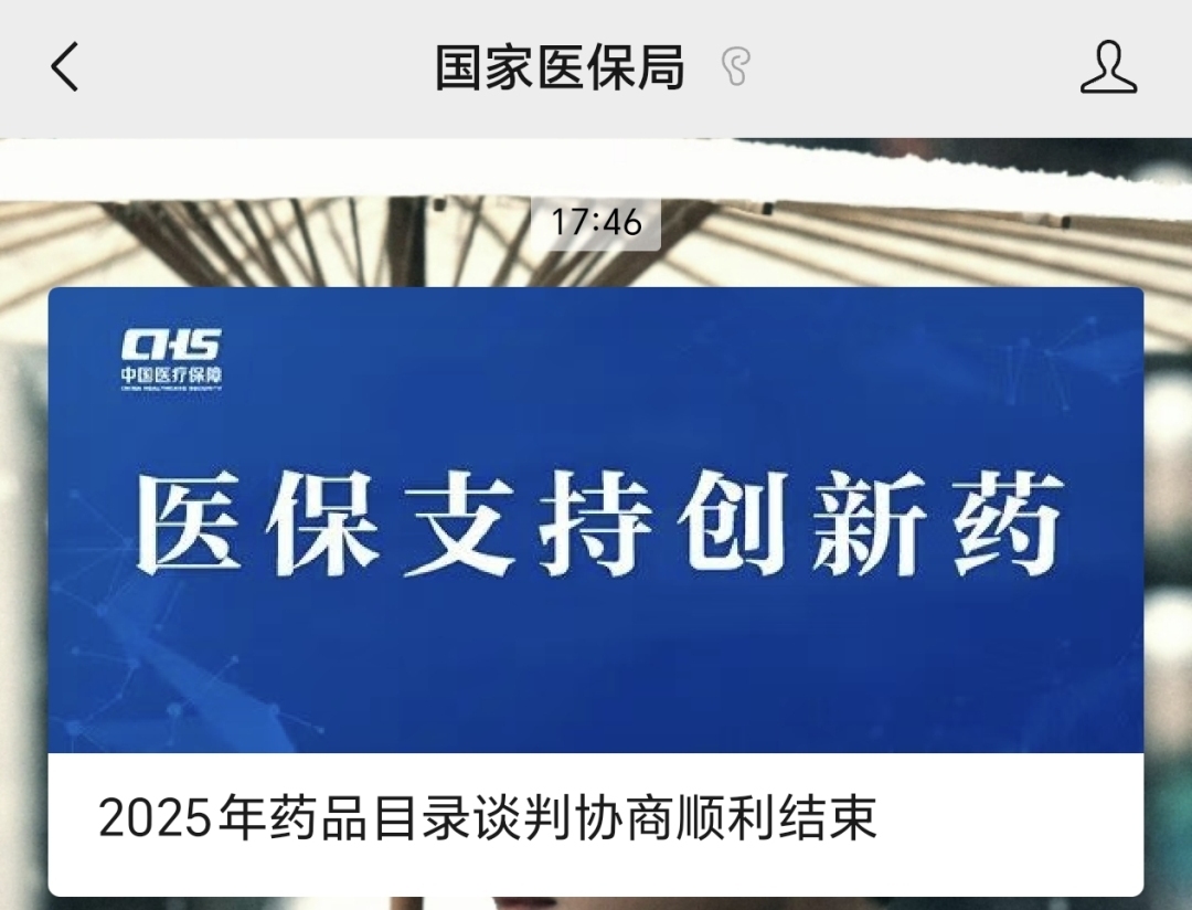 11月4日傍晚,“国家医保局”微信公众号发布消息称,2025年药品目录谈判协商顺利结束。值得关注的是,相关推文的封面配图为“医保支持创新药”。