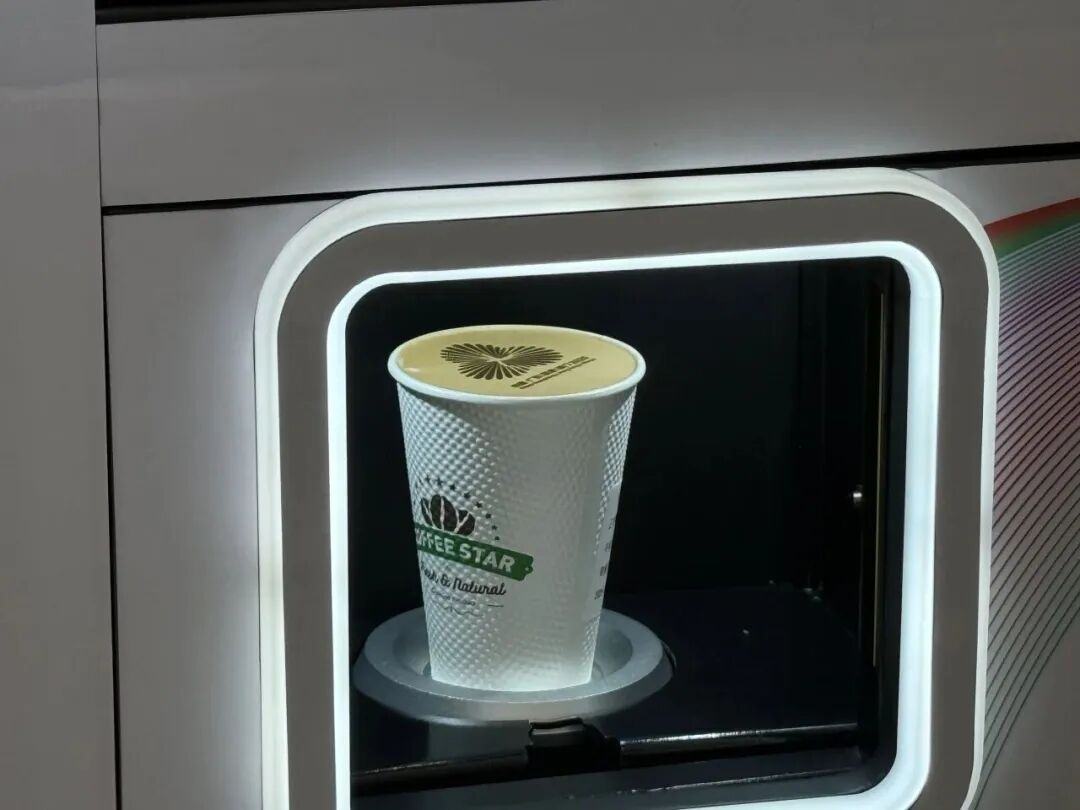 在一个仅比自动售卖机稍大的空间里,一台六轴协作机械臂正灵活地运转:取杯、磨豆、萃取、3D打印拉花、贴标签……动作如行云流水,短短90秒,一杯印有第十五届全运会吉祥物图案的拿铁便新鲜出炉——这就是“酷库咖啡机器人”。