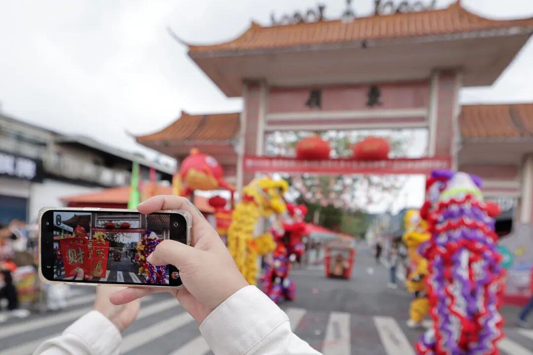 当天上午,锣鼓闹喧天,舞狮送吉祥,翘首以盼的民俗巡游队伍惊喜出游。