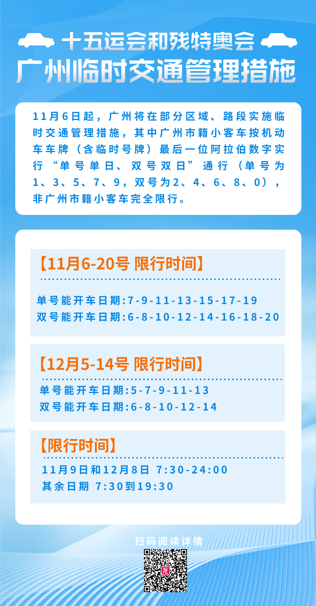 2025年11月6日起,为确保第十五届全国运动会和残特奥会顺利进行,广州市将实施小客车单双号限行、启用专用车道,并对地铁、公交等公共交通服务进行相应调整。