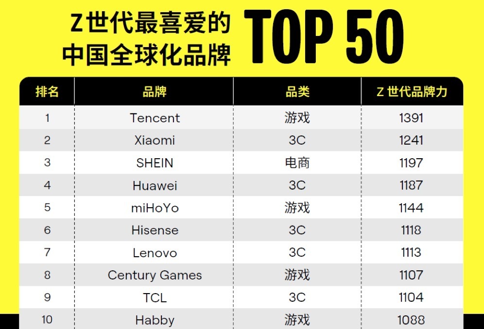 结果显示,相比其他世代消费群体,Z世代对跨境品牌严苛挑剔,对中国品牌接受度最高。“Z世代最喜爱的中国全球化品牌50强”榜单排名前三的分别为腾讯、小米和SHEIN,腾讯在游戏品类、小米在3C品类、SHEIN在电商品类排行榜分列第一。