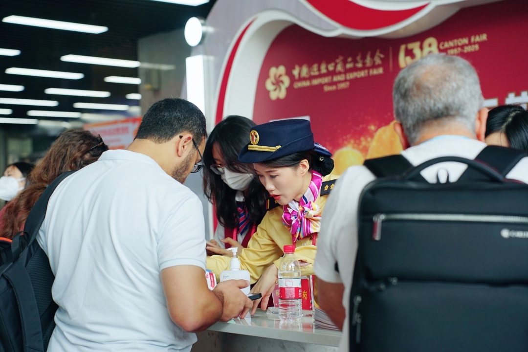 本届广交会期间,广州地铁的外卡支付和购票支付便利性持续提升。所有车站均支持境外发行的万事达卡、美国运通卡、维萨卡、JCB卡“拍卡过闸”功能;重点站点布置外卡POS机、高峰期配备了携带“兑零包”的引导员,协助乘客兑换零钱和购票等服务等一系列服务,这些服务均受到外商广泛好评。同时,本届广交会期间推出主题一日票、主题三日票及“限定五日票”,累计售出约630张。琶洲站还推出了提供路线查询与服务指引的智能机器人,其智能化的引导和灵活移动的能力备受瞩目,吸引了众多客商互动与合影留念。