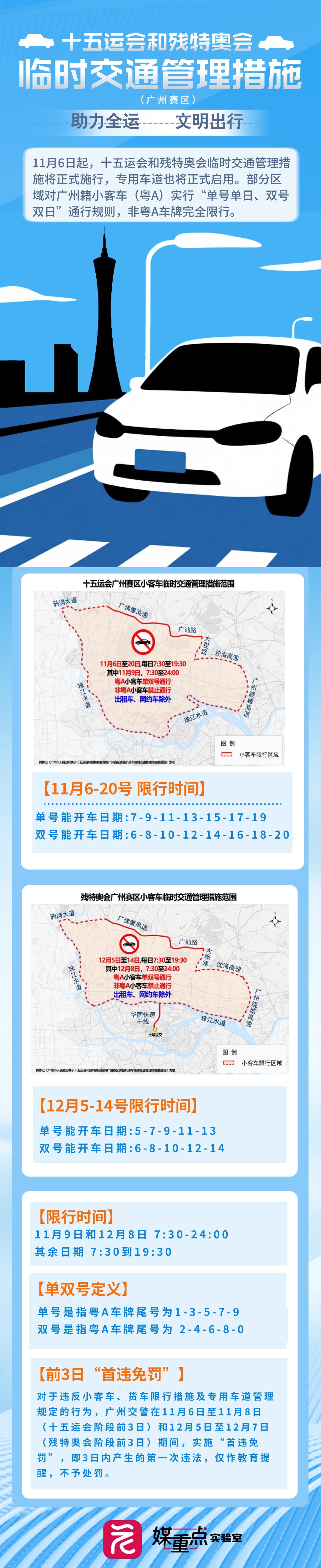 今日(11月6日)起,十五运会和残特奥会临时交通管理措施正式施行、专用车道正式启用。赛事期间(即2025年11月6日至11月20日、12月5日至12月14日)每日7时30分至19时30分,广州在市区限行范围内道路实施临时交通管理措施,其中11月9日和12月8日两项赛事开幕式当天,限行结束时间延长至24时。