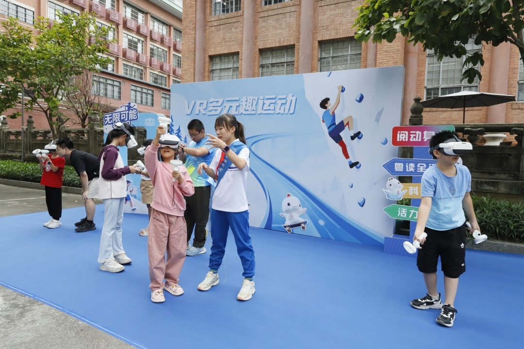 全运会期间,科学阅读会、粤语阅读会等活动着眼于广东特色毽球项目,邀请参与者共同探索毽子的材料特性与空气动力学原理,用粤方言掌握踢毽球的规则与技巧,让传统体育运动更具知识性和地域色彩。少儿创客空间“竞速未来”活动则引导少儿读者制作电动跑步机器人,发现体育新玩法。户外科技体验区更是充满惊喜。小读者透过VR眼镜穿越至极地滑雪、定向运动、攀岩等六大场景,惬意畅享多样运动。