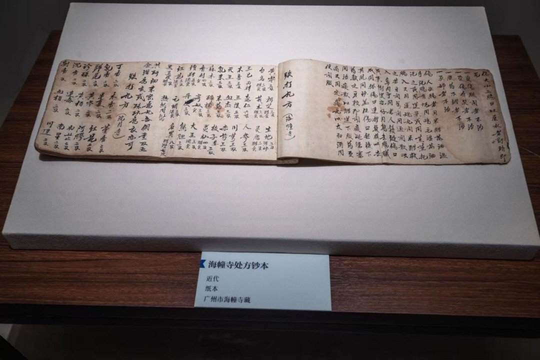 本次展览共展出展品83件,其中重点展品包括:1796年西班牙人阿格特订制海幢寺外销画册、王文诰《长牧庵制府带同荷兰国贡使诣海幢寺接诏恭纪》诗(见《韵山堂诗集》)光绪十四年(1888刻本)、林世荣《工字伏虎拳》、近代海幢寺处方钞本等。