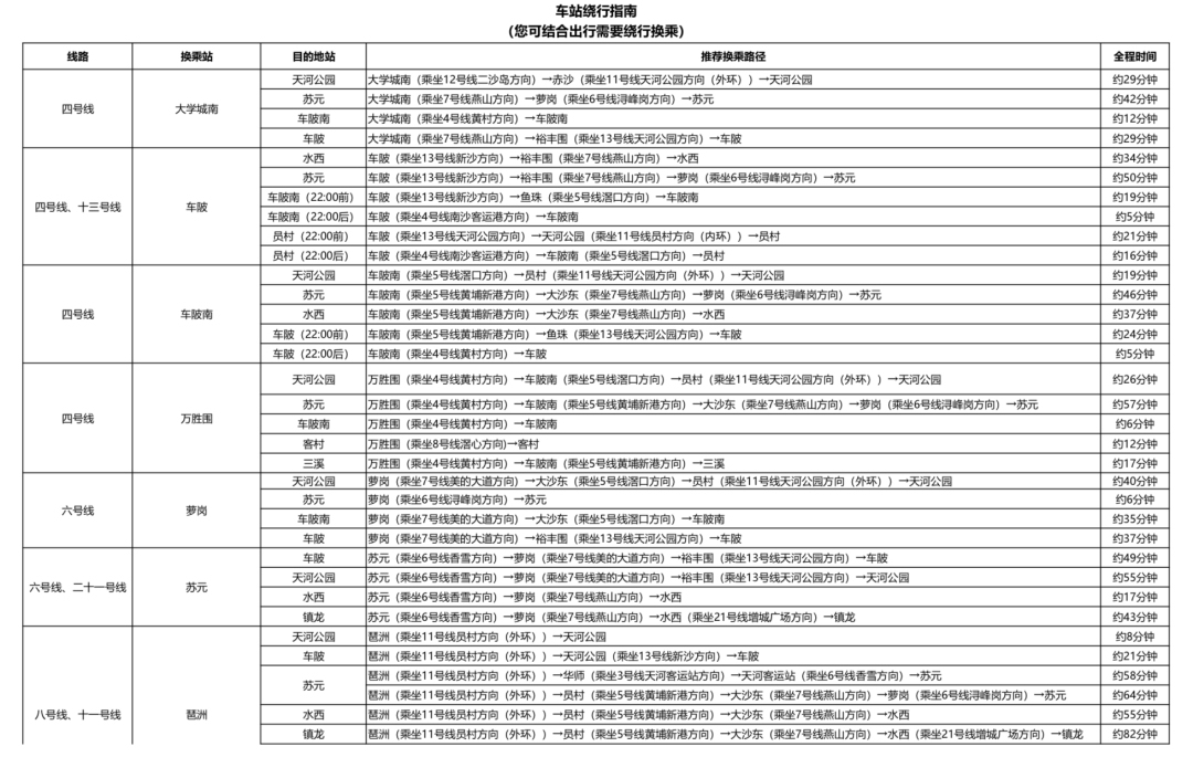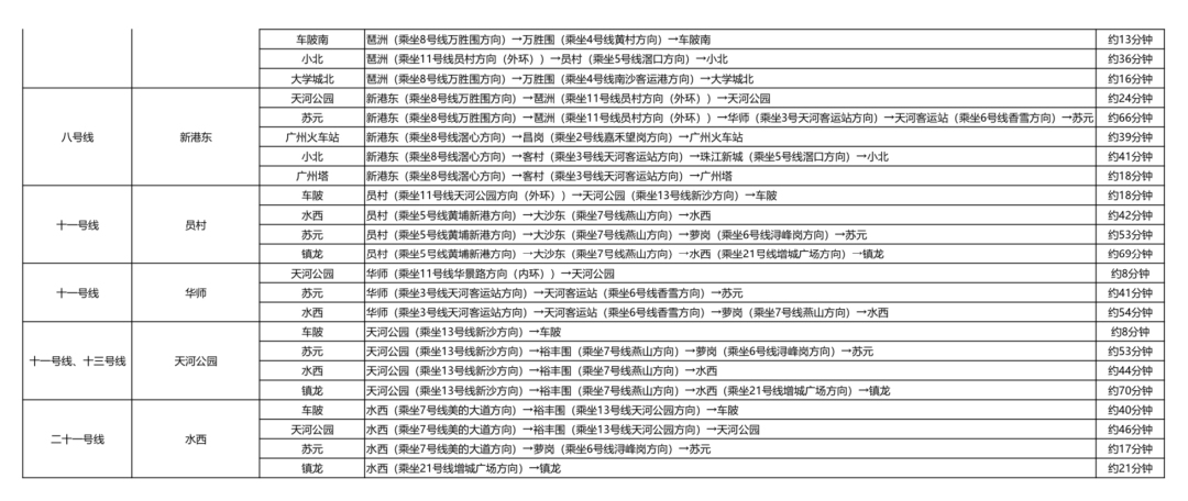 11月9日,前往广州科技教育城的乘客,可搭乘七号线至水西站换乘二十一号线前往,或搭乘十四号线至镇龙站换乘二十一号线前往;去往广州现代信息工程职业技术学院、私立华联学院、广东岭南现代技师学院(南校区)的乘客可搭乘至十三号线天河珠村站或七号线姬堂站转乘其他交通工具。