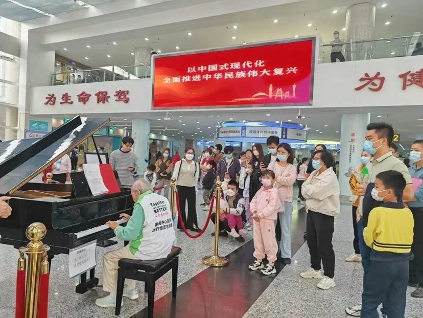 在番禺区中心医院门诊大厅,90岁的邬品贤老人端坐钢琴前,指尖流淌出《我和我的祖国》的旋律。从2023年8月底开始,邬姨就成了这里的音乐志愿者。“去做好事,尽力而为”是她的人生信条。右眼视力受损的她,需要把曲谱大大地抄写下来再背熟;老伴过世后,她在志愿服务中找到了新的人生价值。