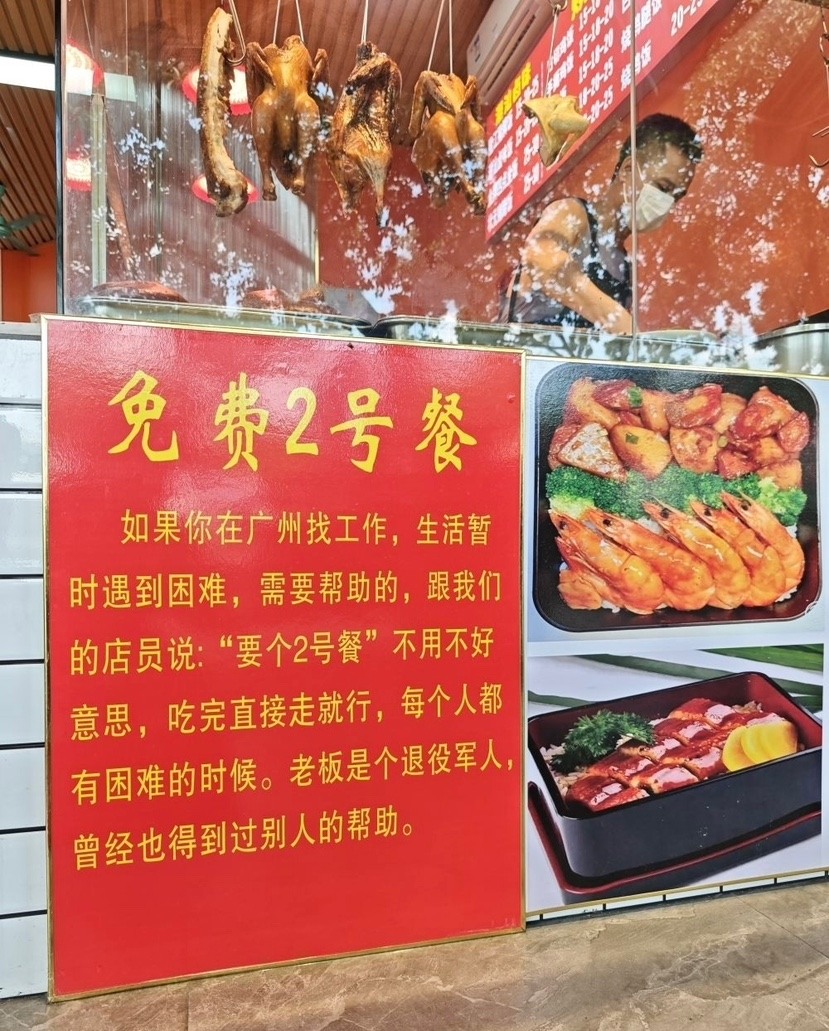 在广州市番禺区一家寻常餐厅的门口,一张红色告示温暖了无数人的心:“如果您在广州找工作遇到困难,需要帮助,可以小声告诉店员:‘要一份2号餐’。不必客气,吃完直接离开就好。”