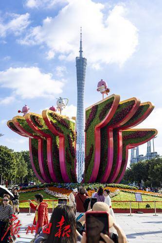 原来这是迎接十五运会的巨型艺术装置,作为市花的木棉花形状凸显广州特色,人们只要移到中轴线正中位置,还能拍到木棉花和广州塔的合影,广州塔仿佛成了木棉花的花蕊,花瓣上的“喜洋洋”“乐融融”像花仙子般各自运动,十分可爱。