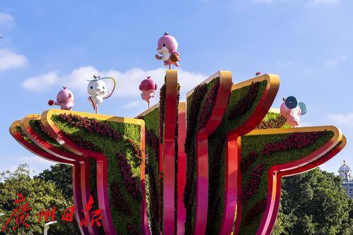 近日,一朵巨型“木棉花”在广州花城广场“绽放”,“花瓣”上还有好几只十五运吉祥物“喜洋洋”“乐融融”在进行篮球、艺术体操、举重、拳击等运动,吸引市民游客拍摄。