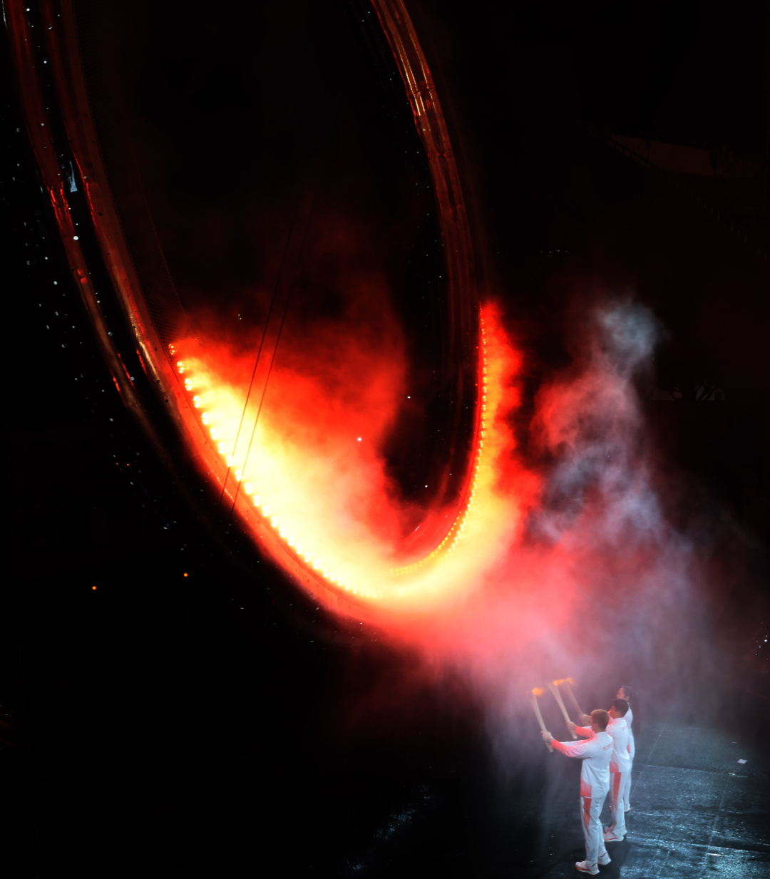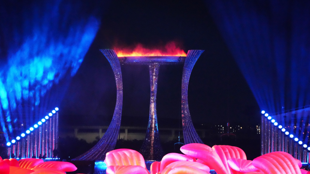 而火炬塔的形态,更蕴含着深刻寓意。三根鼎立的支柱,象征着粤港澳三地;顶部的圆环与地面的水舞台,共同呼应着“同心圆”的主题。在点火的高潮时刻,三根支柱由外弯转为内弯,稳稳托举起被点燃的圆环——一个寓意着“三地同心,中华梦圆”的“天海之冠”,终于完美绽放。