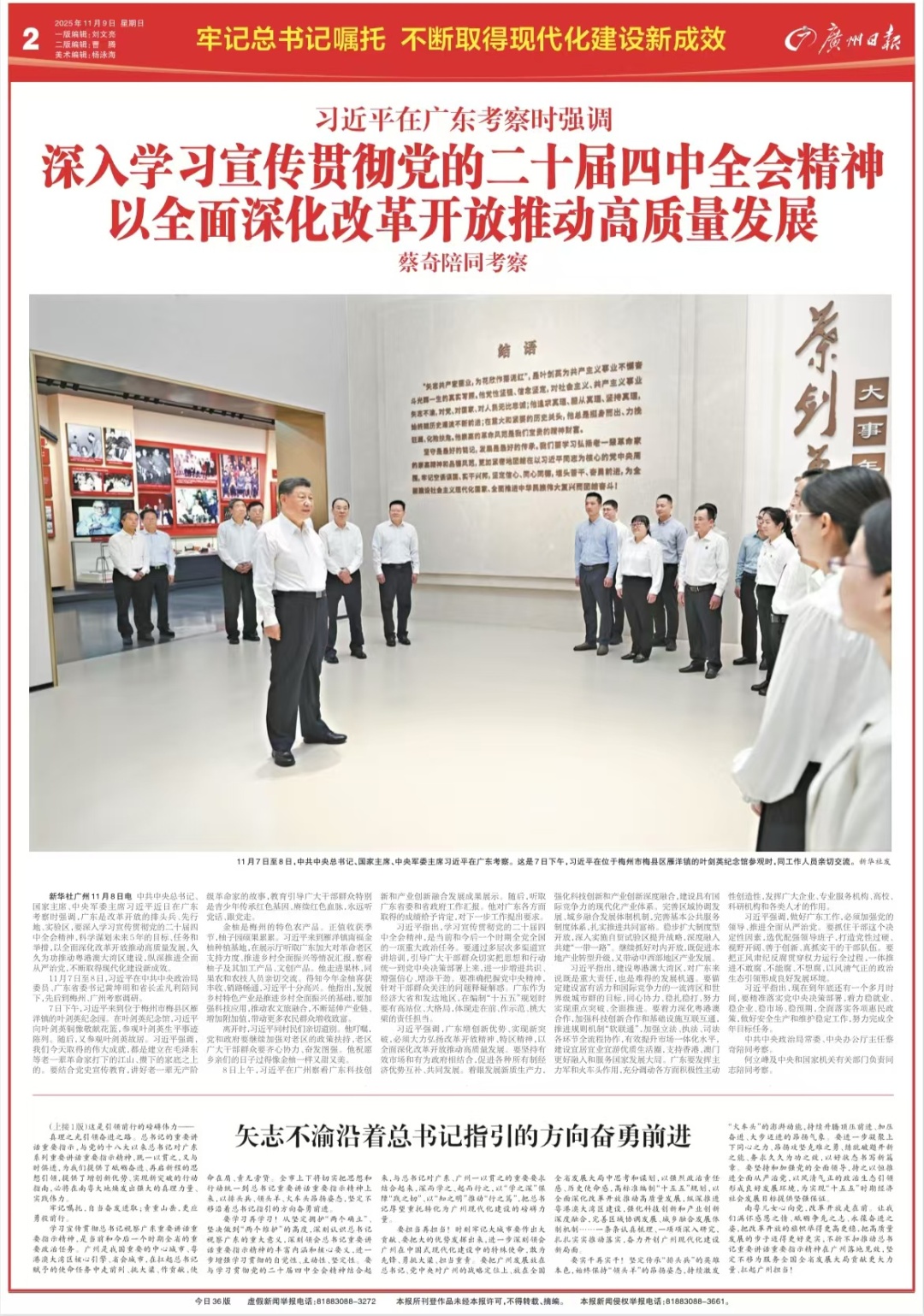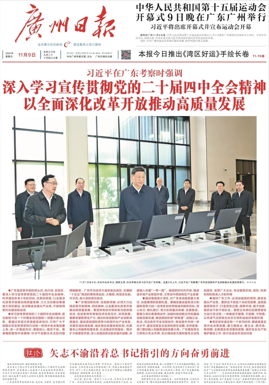 在全省上下深入学习宣传贯彻党的二十届四中全会精神的热潮中,在粤港澳三地喜迎十五运会的浓厚氛围里,习近平总书记再次亲临广东视察,发表重要讲话、作出重要指示,极大鼓舞了南粤儿女的壮志豪情,强力激荡起感恩奋进的磅礴力量。