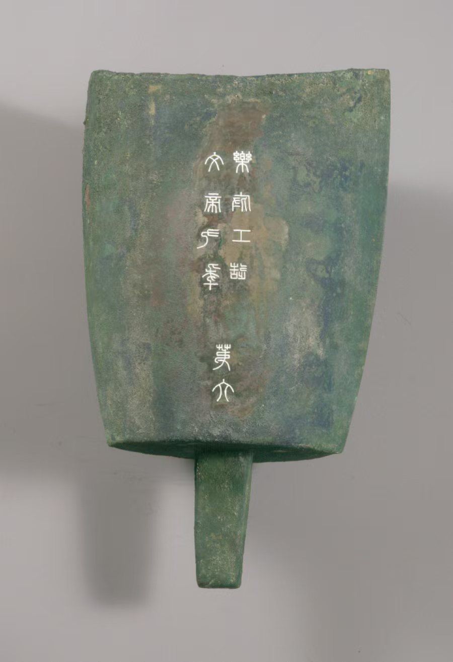 在八件铜句鑃的表面,都阴刻着两行平行的篆文“文帝九年 乐府工造”。说明这套青铜乐器是在南越文王赵眜在位第九年(即汉武帝元光六年,公元前129年)制成的。“乐府”二字反映出南越国效仿中原设有乐府这一音乐机构,可见南越对中原文化的吸收和融合。“乐府”的铭文,也是古代“物勒工名”制度的体现,乐府机构的工匠们将姓名或官职铸刻于器物上,以便监督器物质量和追溯产品责任。在这八字铭文的正下方,还分刻有“第一”到“第八”的序号,与其大小正好对应,体现了南越乐府对礼仪乐器的规范化管理。