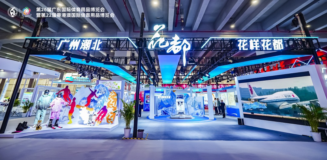 穿过本届体博会正门往前直走,在主会场旁边便可以一眼看到“广州·花都,离世界最近的地方”几个醒目的大字,这便是花都区展区。整个展区宛如一场浓缩的活力盛宴。巨型发光字“花都”“花样花都”在顶部亮起,蓝色灯光装置勾勒出时尚轮廓;展板上“世界跳绳看花都”“南方滑雪来花都”等标语,搭配跳绳队列、雪山背景,将运动、冰雪与城市特色巧妙融合。