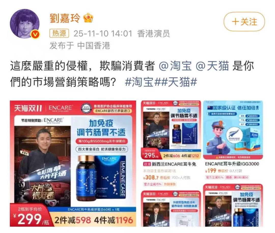 11月10日14时,演员刘嘉玲在社交平台公开发文,并贴出两张淘宝界面截图,直接喊话淘宝与天猫,质疑其平台商家存在侵权行为。记者发现,在刘嘉玲发声后不到一小时,涉事品牌方已迅速将相关侵权图片更换(详见报道热点|刘嘉玲喊话淘宝天猫侵权 涉事品牌已将图片更换)。
