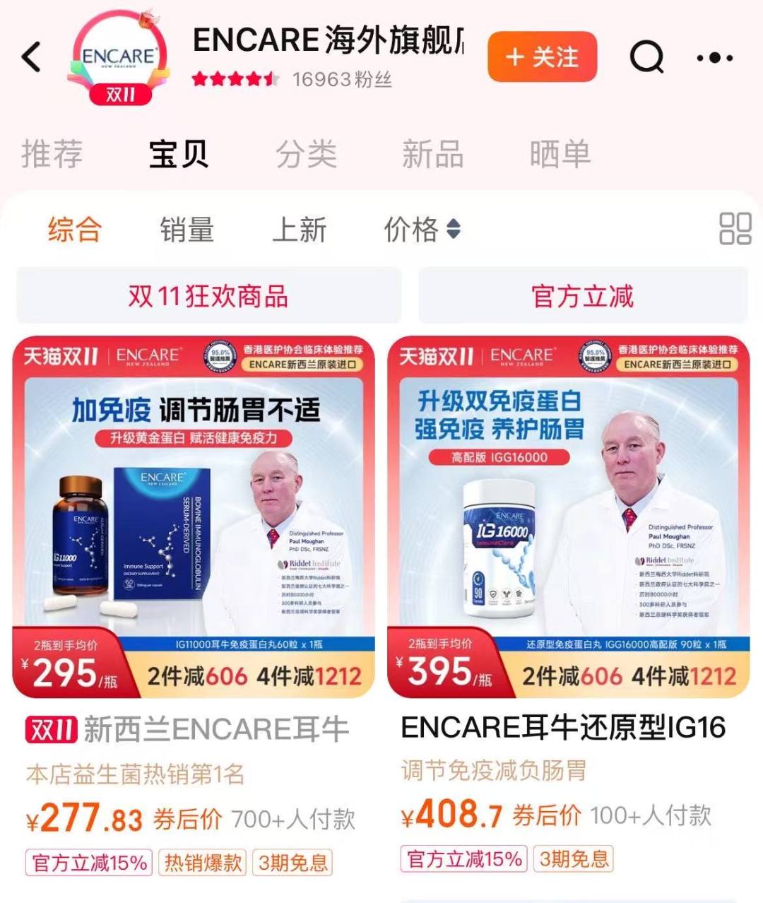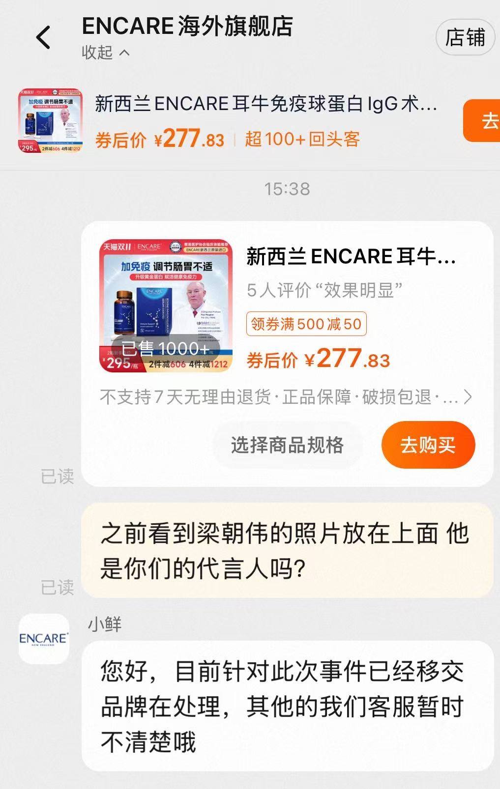 她晒出的截图显示,这是一家名为“ENCARE海外旗舰店”(粉丝数1.6万)的天猫国际店铺,在其商品“新西兰ENCARE耳牛免疫球蛋白”首页,未经授权使用了梁朝伟的半身照片。