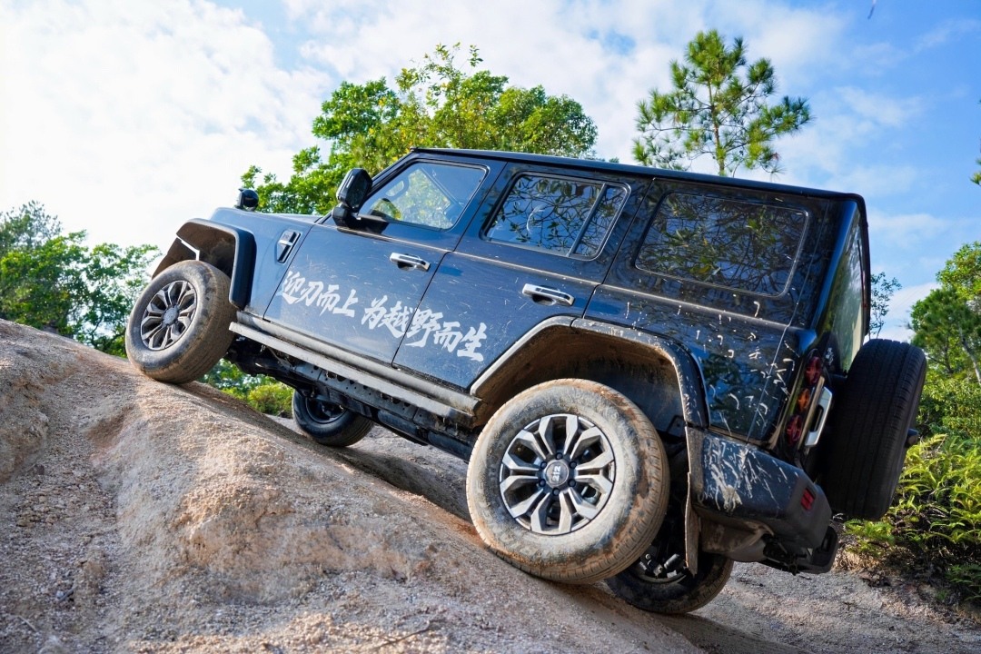 在传动与悬挂系统方面,车辆采用前后五连杆非独立悬架结构,搭配高强度钢传动轴总成与自主首创的喇叭口等速万向节,确保动力传递稳定高效。前后驱动桥桥壳采用整张钢板一体冲压焊接工艺,仅一条焊缝的设计可承受百万次垂直弯曲疲劳测试,以极致工艺保障越野场景下的耐用性与安全性。