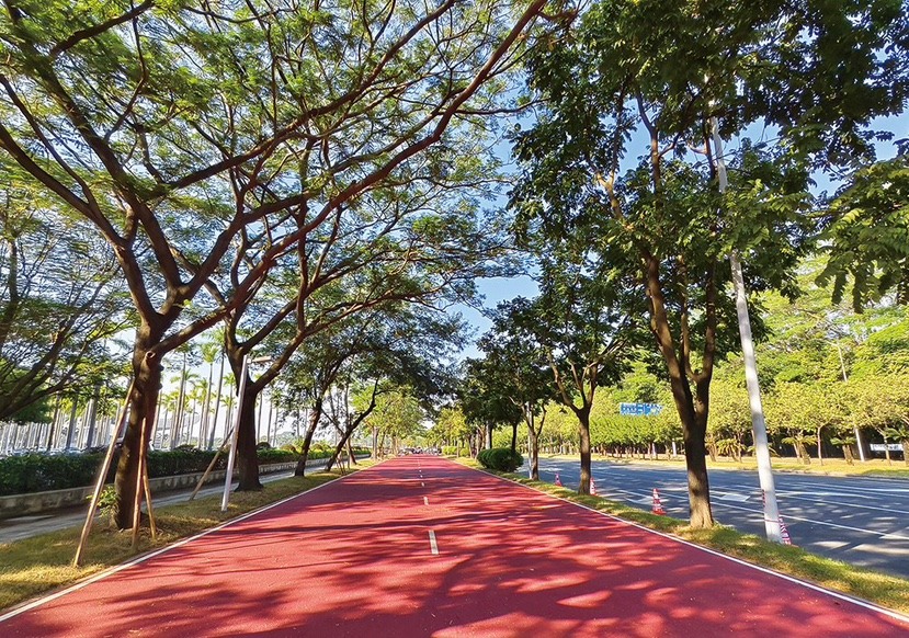 走进广州大学城,体育中心周边内环路、中环路、外环路的景观焕然一新,不同区域的非机动车道通过色带规划实现“一路一色”。如内环路披上活力橙色、中环路铺装宁静蓝、外环路跃动热情红,不仅路面平整、通行安全,更以鲜艳色带增强了游览性和视觉引导性。道路两侧,乔木舒展枝叶,地被绿意绵延,形成整洁通透的绿色廊道。在广州大学城体育中心周边的一些重要节点,时花缤纷绽放,与绿树、草皮相映成趣。在中环路高校门口区域,绿化带经过精细化改造,结合高校文化特色,打造出一个个兼具文化艺术展示与休闲功能的“口袋公园”和“校门前客厅”,广药的百草园,设计百草墙及树池座椅,对应学校专业特色;华工的光电园,设计特色座椅、科技环,成为彰显高校气质、提升街区品质的亮丽风景,大大提升校门口环境。