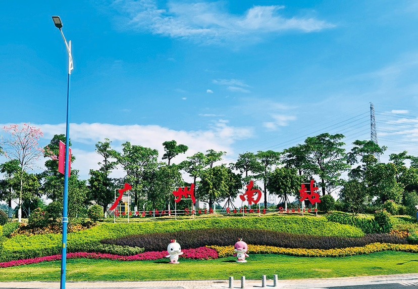 作为广州重要门户的广州南站,其园林绿化品质提升项目通过标识地块改造、东西出发平台挂花加密、节点渠化岛景观提升、时花布置等举措,打造1.2万平方米的亮丽门户景观。在东新高速石洲中路出口处,广州南站标识LOGO被翻新点亮,配以造型别致的灌木与色彩斑斓的时花,瞬间“激活”了城市门户的仪式感,让每一位抵达的旅客眼前一亮;南站东、西出发平台匝道,挂在护栏上的花箱如同一条流光溢彩的“空中花廊”,为行色匆匆的旅途注入了一抹温馨与浪漫;核心区一些主干道相交路口,营造出四季有花、层次分明、步移景异的绿化景观。通过“绣花功夫”般的精细打造,一个更生态、更宜居、更具魅力的“粤港澳大湾区会客厅”展现在世人面前。