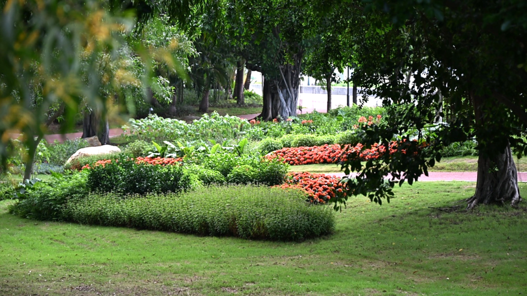 植物搭配是参考了广州本土植物群落,我们尊重它们在野外的生长特性。野外常伴生的植物,在这里也让它们相邻而长,模拟自然里的群落结构。其中佩兰、龙船花、假杜鹃等开花植物都是蝴蝶的“蜜源补给站”,能为成年蝴蝶、蜜蜂等传粉昆虫提供持续花蜜;柠檬、柑橘、马利筋等则是“幼虫育儿所”,专门为蝴蝶幼虫提供栖息场所与食物。更让人意想不到的是,当蝴蝶飞来之后,暗绿绣眼鸟、红耳鹎、黑脸噪鹛等鸟类也纷纷前来“拜访”。