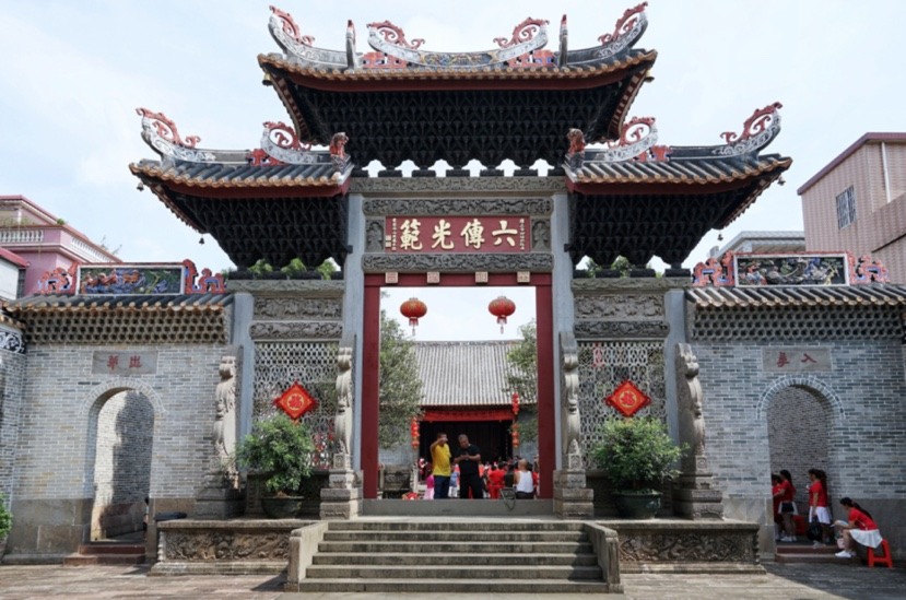 俯瞰番禺的古建筑群,多条生动的鳌鱼跃然其上。始建于明朝的大型古庙群——鳌山古庙宇是典型的岭南风格建筑,建筑严整,外观气派。因山体像鳌,故得名鳌山。
