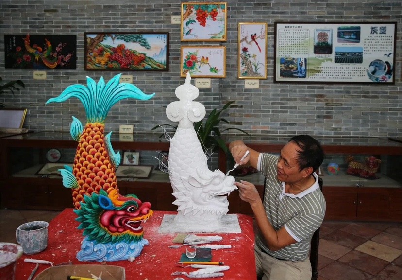 崔镜兴是广州市非遗灰塑项目代表性传承人,从事灰塑这个行业已有40多年,他以修复和创作灰塑作品闻名,尤其擅长鳌鱼题材的灰塑创作。在他巧手之下,鳌鱼灰塑作品栩栩如生,装扮了广东名园余荫山房等古园古祠。