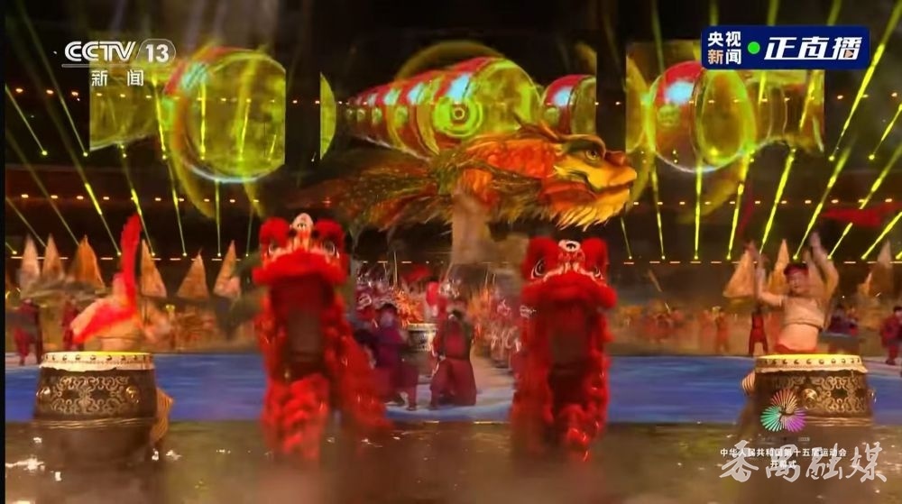 精成龙狮队(右侧)在全运会舞台上演出
