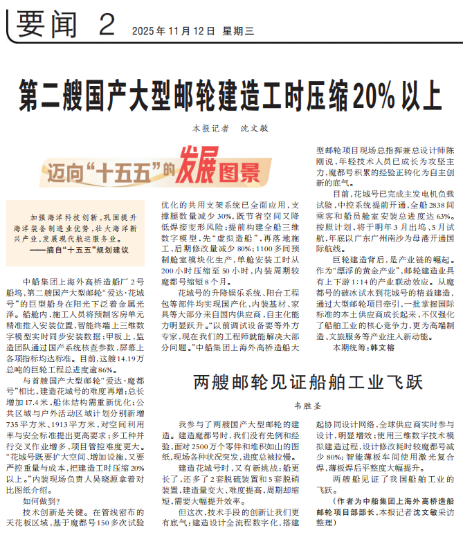 “以前调试设备要等外方专家,现在我们的工程师就能解决大部分问题。”中船集团上海外高桥造船大型邮轮项目现场总指挥兼总设计师陈刚说,年轻技术人员已成长为攻坚主力,魔都号积累的经验正转化为自主创新的底气。