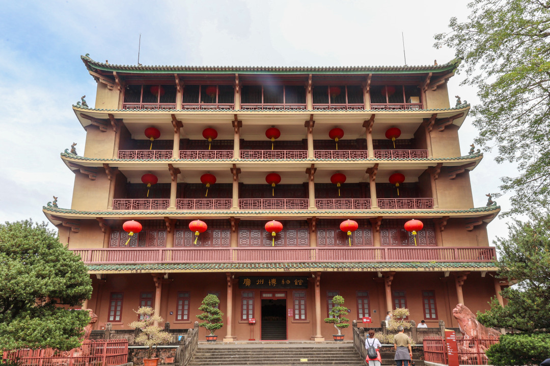 岭南第一楼高达17.5米,顶部是重檐歇山式的绿琉璃瓦,正脊中央是葫芦宝珠刹,两端有两条倒立的鳌鱼,颇具岭南风格。