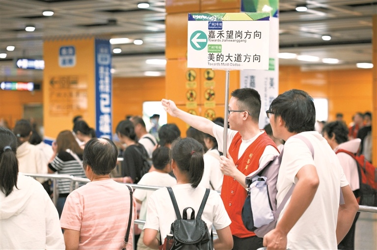 广佛已开通三条地铁线路,两地联系更加密切。图为广州地铁志愿者正在指引乘客。