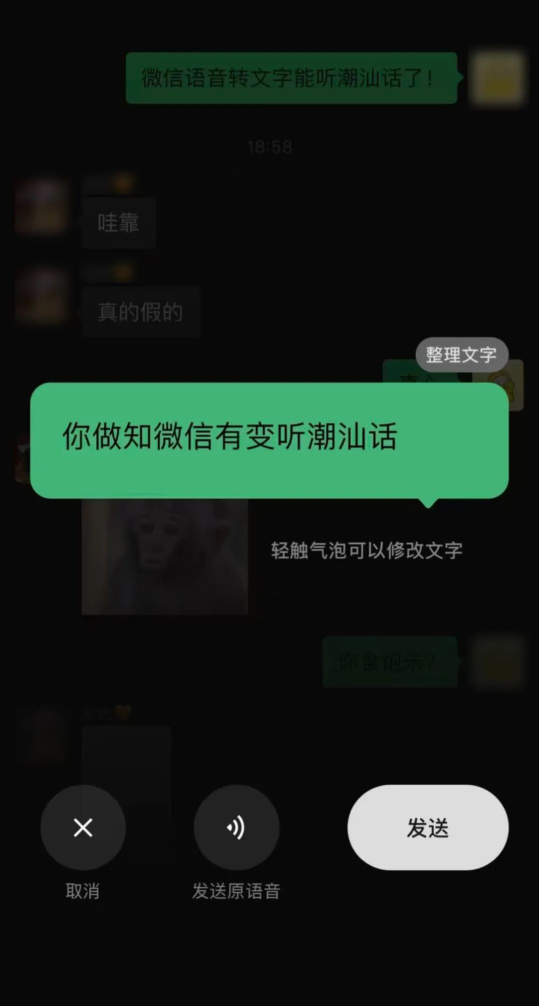 然而,这一功能已经收获不少潮汕人“点赞”:长按发语音说潮汕话,上滑选“转文字”,像“你在做尼”“你食未”“来去踢桃”等等,识别准确率挺高。这下,不擅长打字的长辈,也能轻松用潮汕话发文字消息啦。