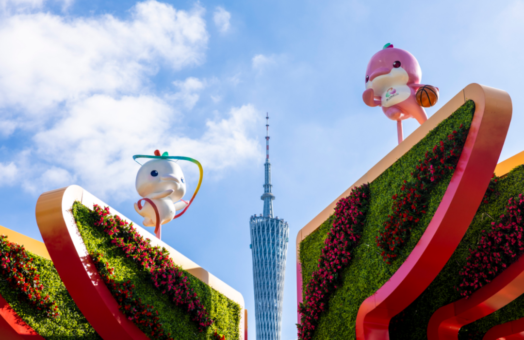 艺术体操“喜洋洋”和篮球“乐融融”与广州塔同框。
