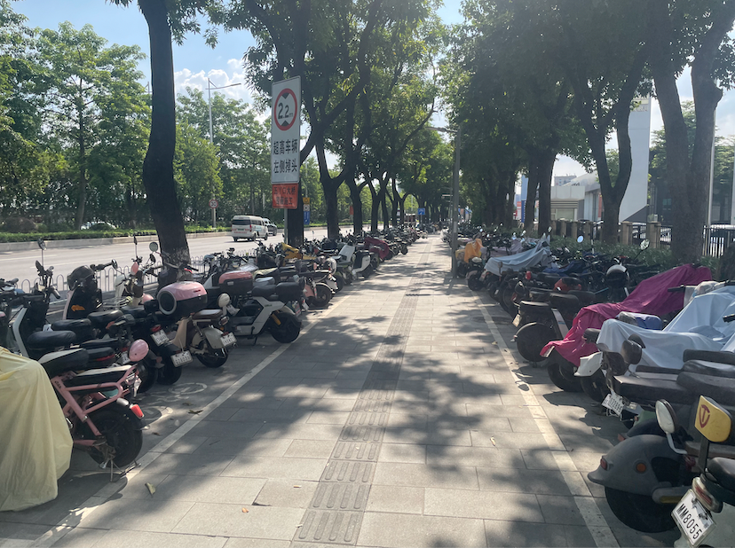 龙溪地铁口位于荔湾区海龙街道辖内,周边分布着凤池、蟠龙、西浦等村,以及众多花卉、汽车交易市场,是周边市民日常出行的重要交通场所之一,平时有不少居民会从居住地骑共享单车、电动车到地铁口转乘,车辆乱停放现象明显。此外,随着时间推移,部分人行道出现铺装、路肩破损,盲道磨平等现象,存在一定的安全隐患。