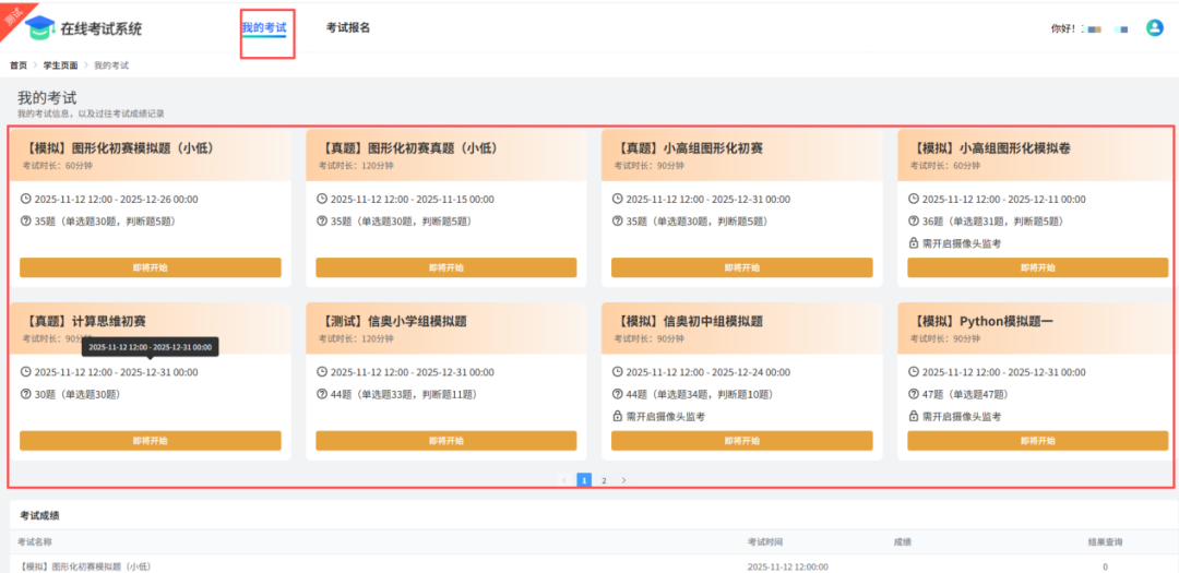 (3)模拟测试:所有报名参加科学素养(信息学)实践组比赛的选手,可于2025年11月14日起登录系统进行模拟测试(2次机会),提前熟悉答题系统操作、检测设备运行状况,确保比赛顺利进行。