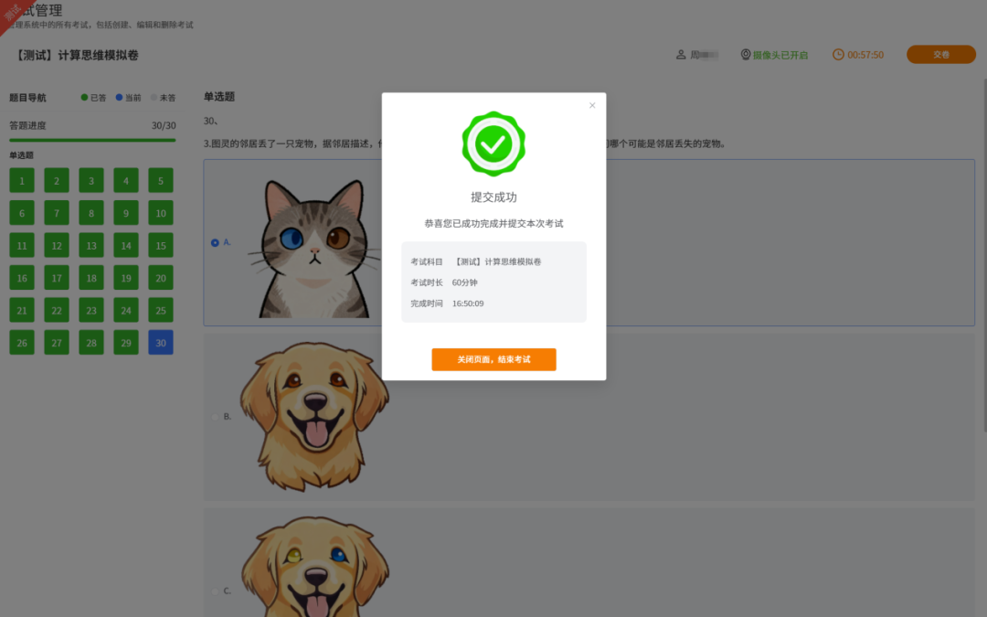 ⑤提交试卷:答题完毕,仔细检查后点击【交卷】,系统在倒计时结束后也会自动交卷。