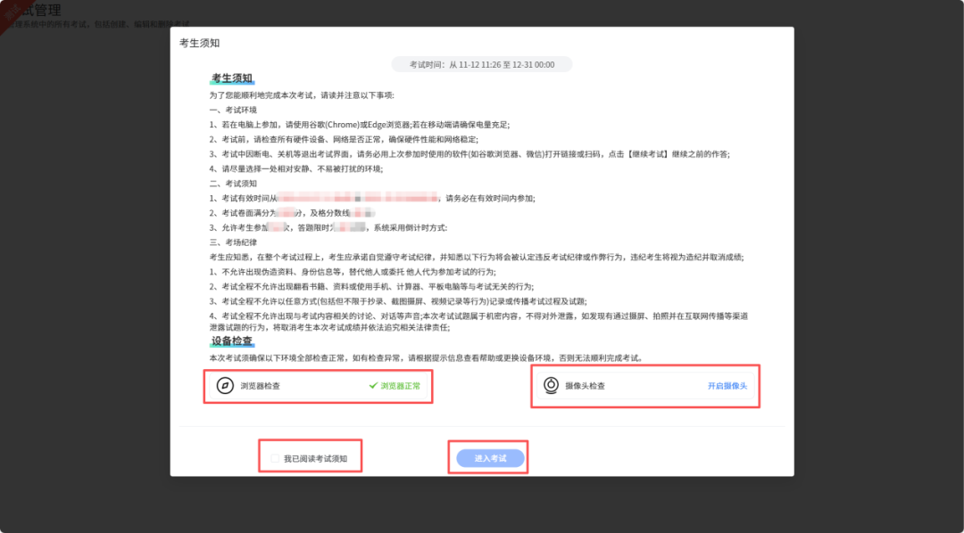 ③点击【进入考试】,确保设备正常,开启摄像头。