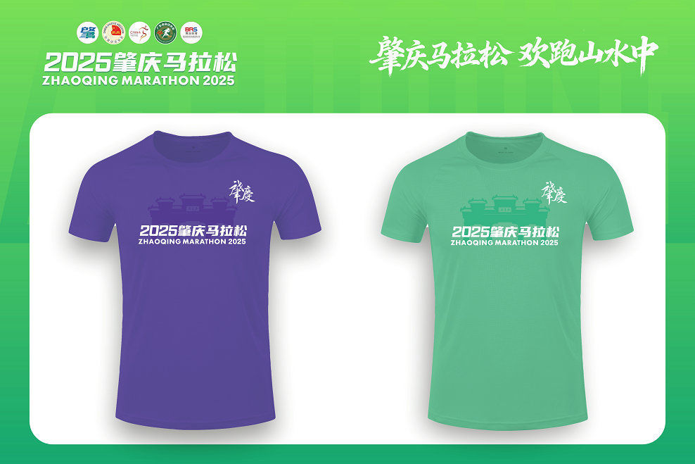 参赛服则以颜色区分项目:马拉松项目选用紫色,灵感来自紫荆西堤的烂漫花景;半程马拉松项目则为绿色,象征着肇庆如诗如画的青山绿水,既呼应了肇庆生态底色,又传递出“欢跑山水中”的赛事理念。